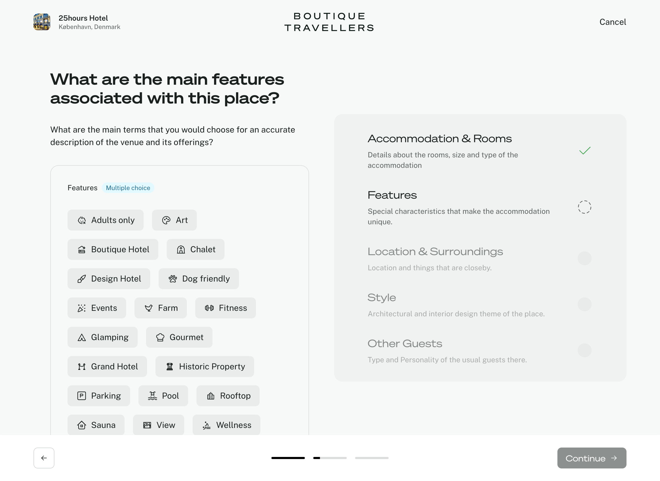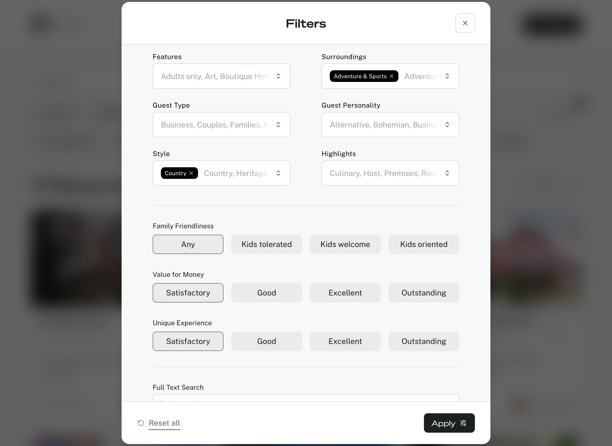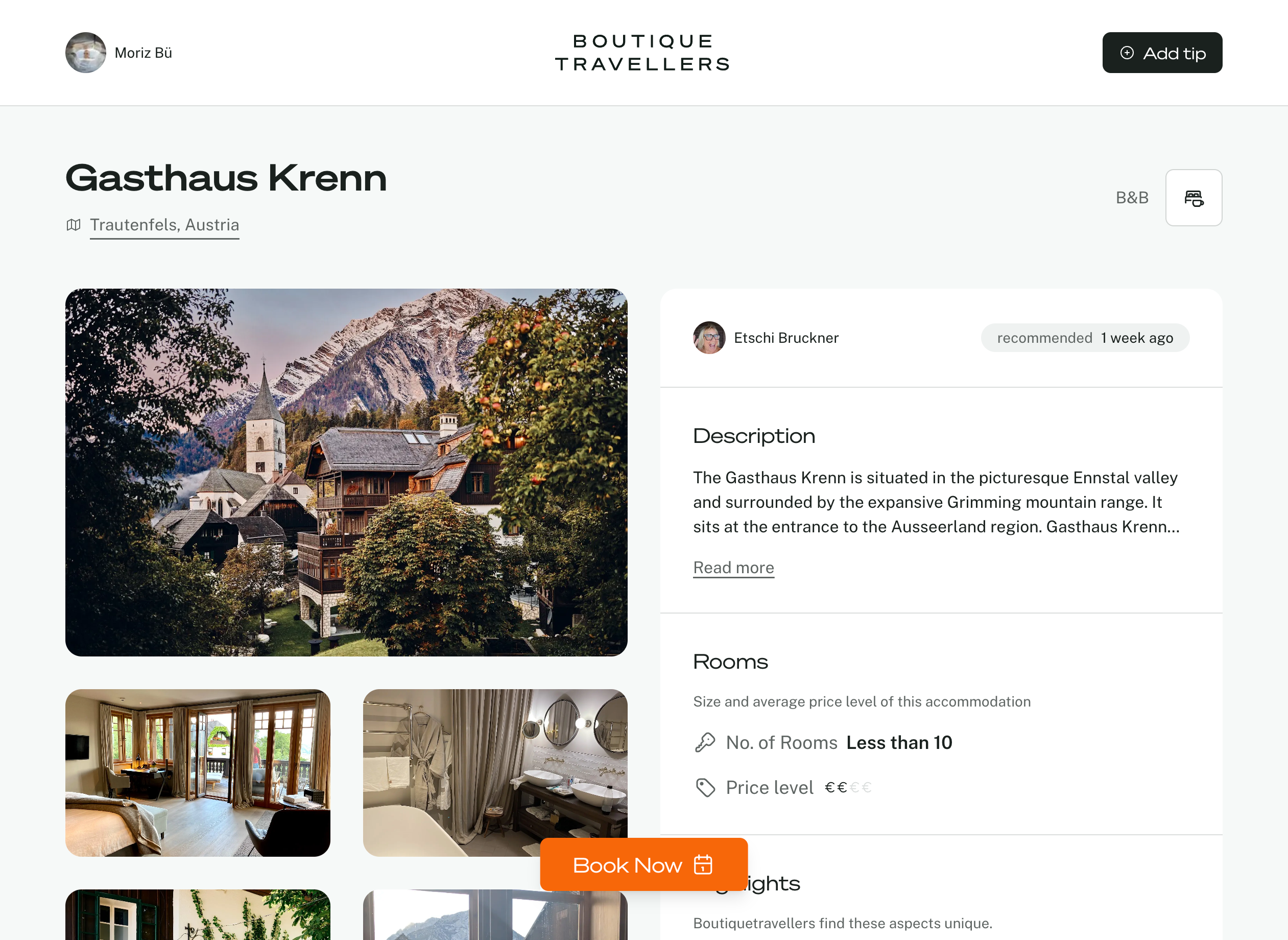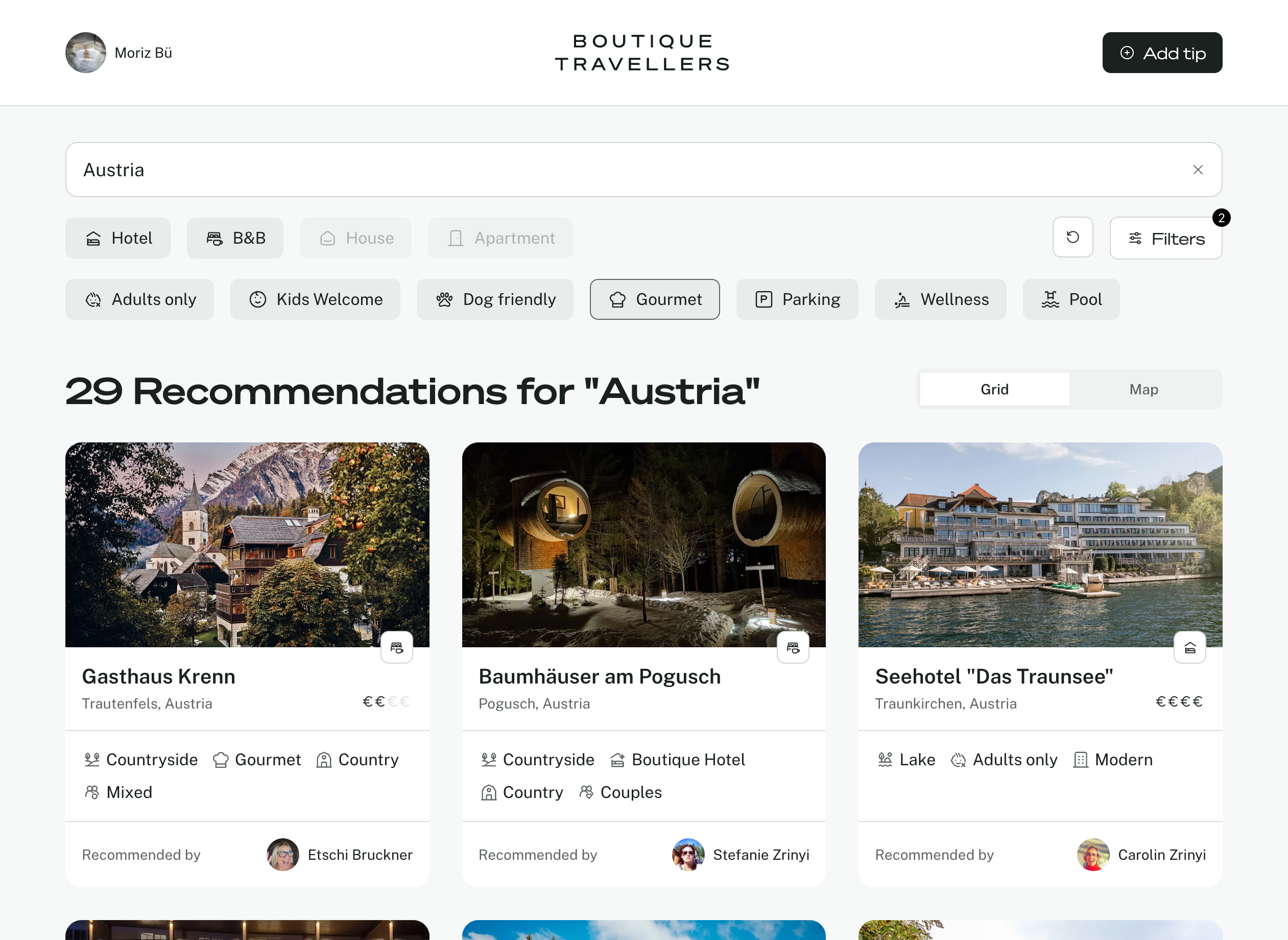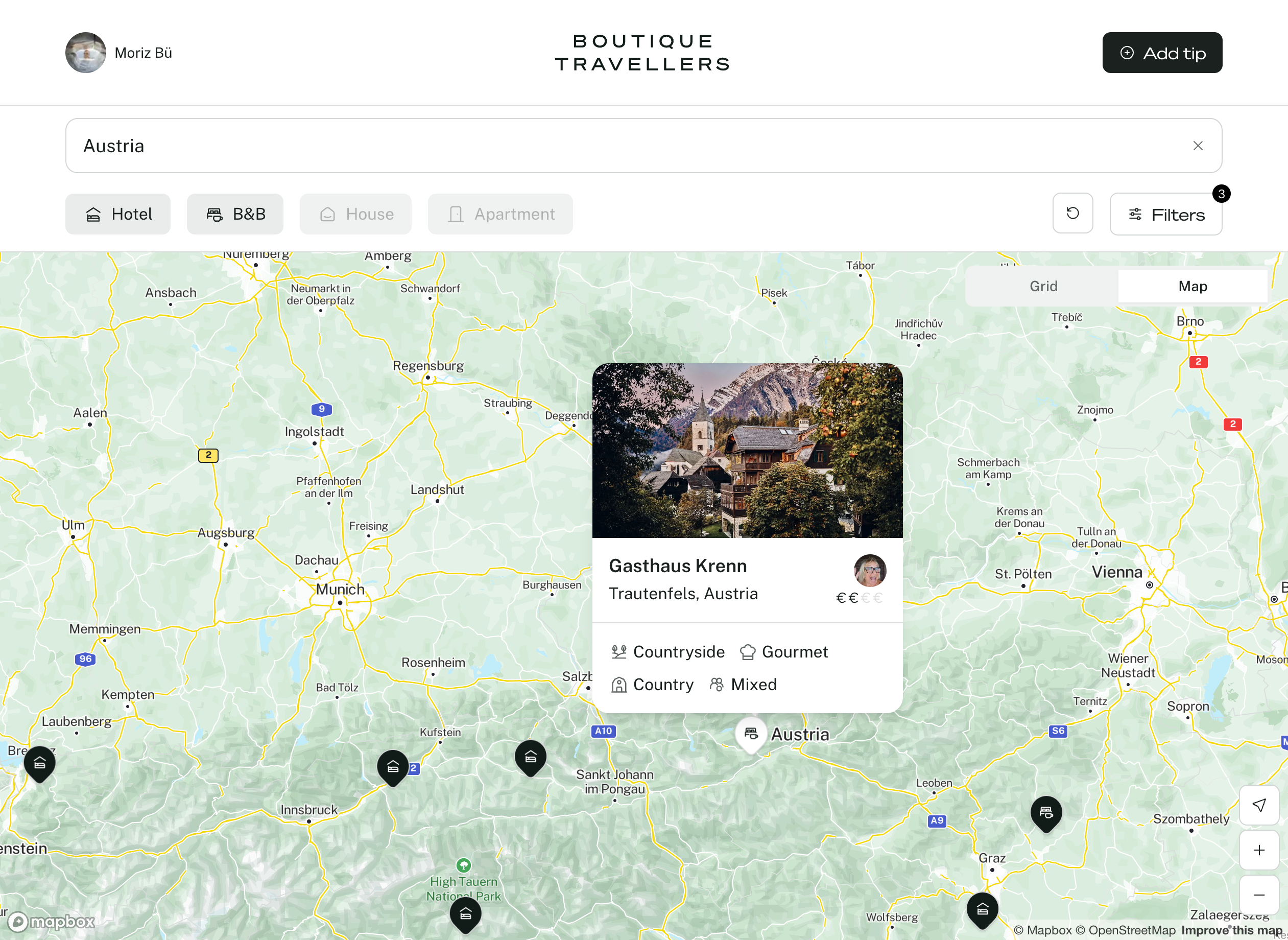 Lifestyle travel platform featuring instant accommodation search and filtering. Map view with clustered accommodation layers. Built with Next.js and Supabase