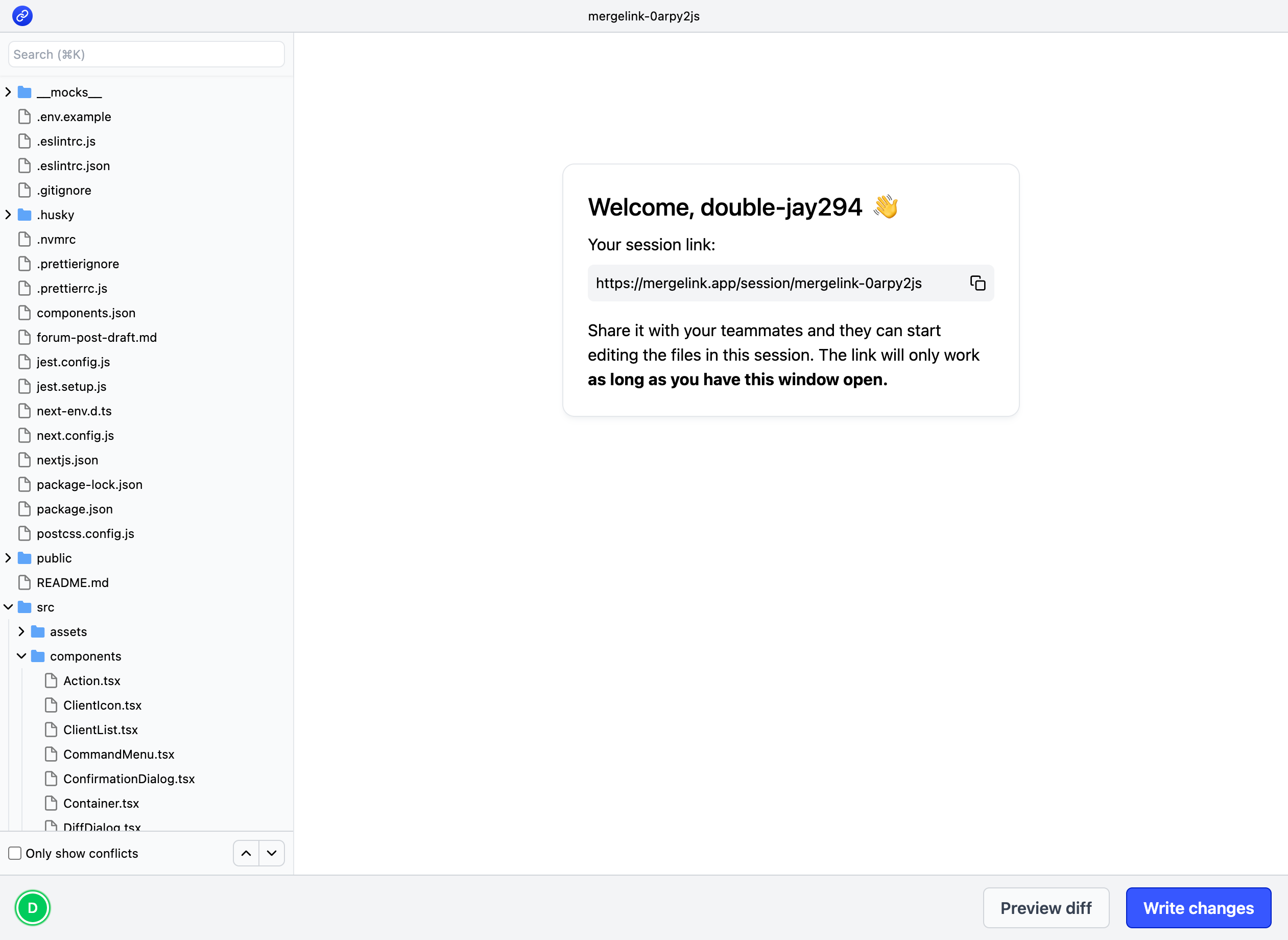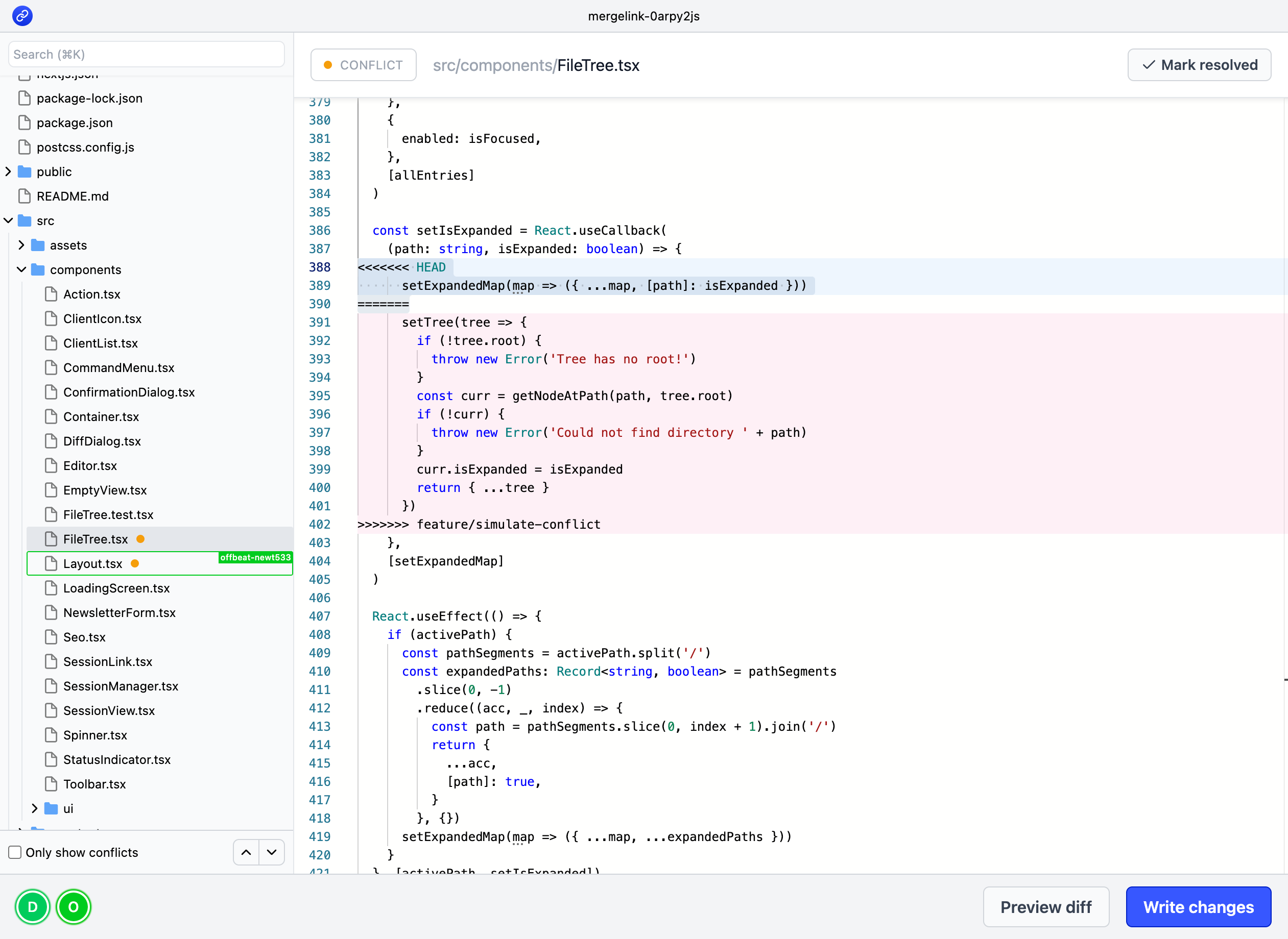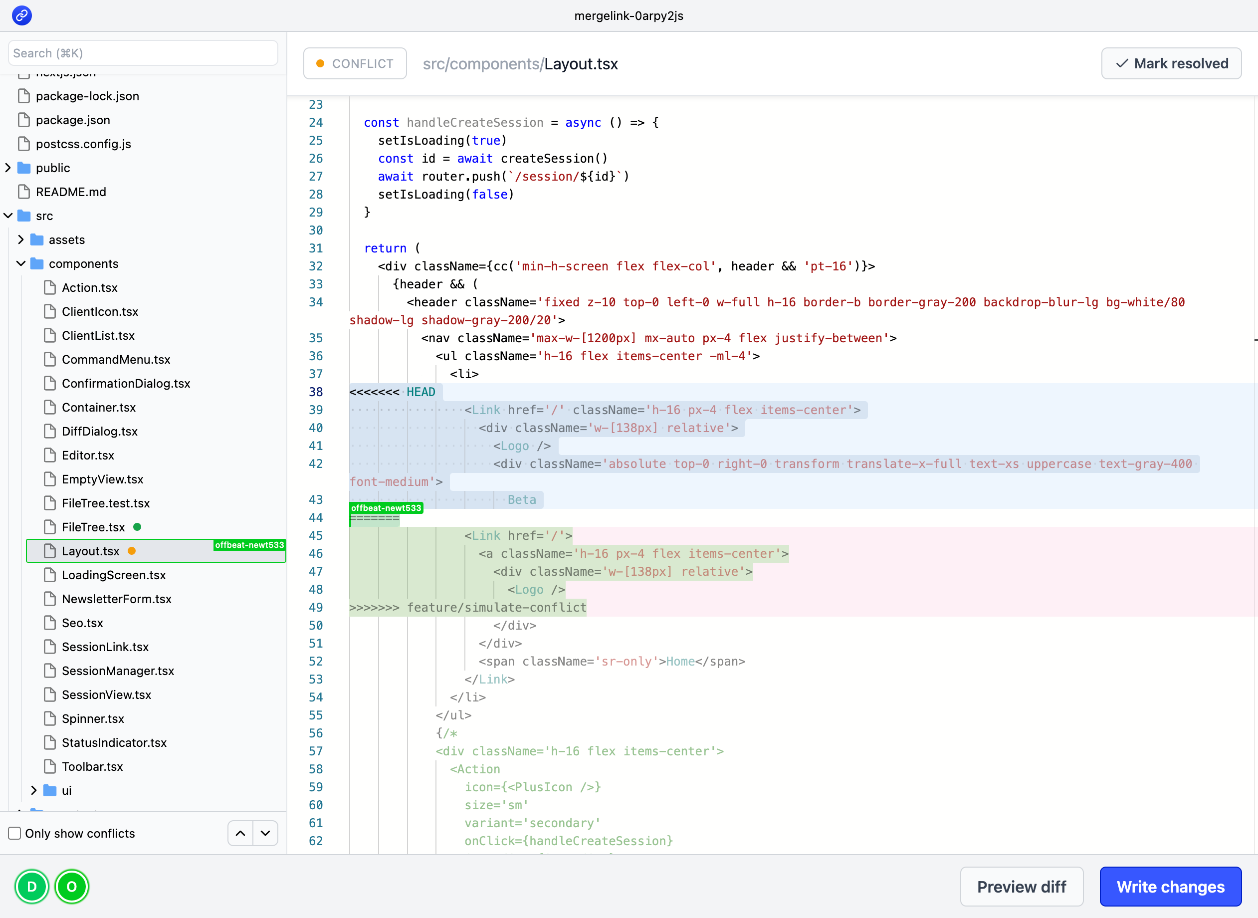 Collaborative tool for developers that streamlines solving git merge conflicts. Built with React, Next.js and Yjs.